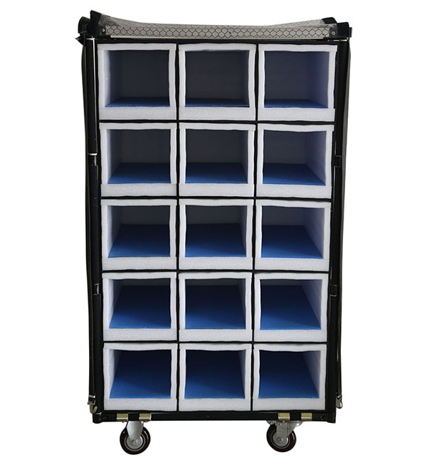 周轉(zhuǎn)車主要由精益管、金屬連接件、中空板、減震EVA、防塵布罩等組成。